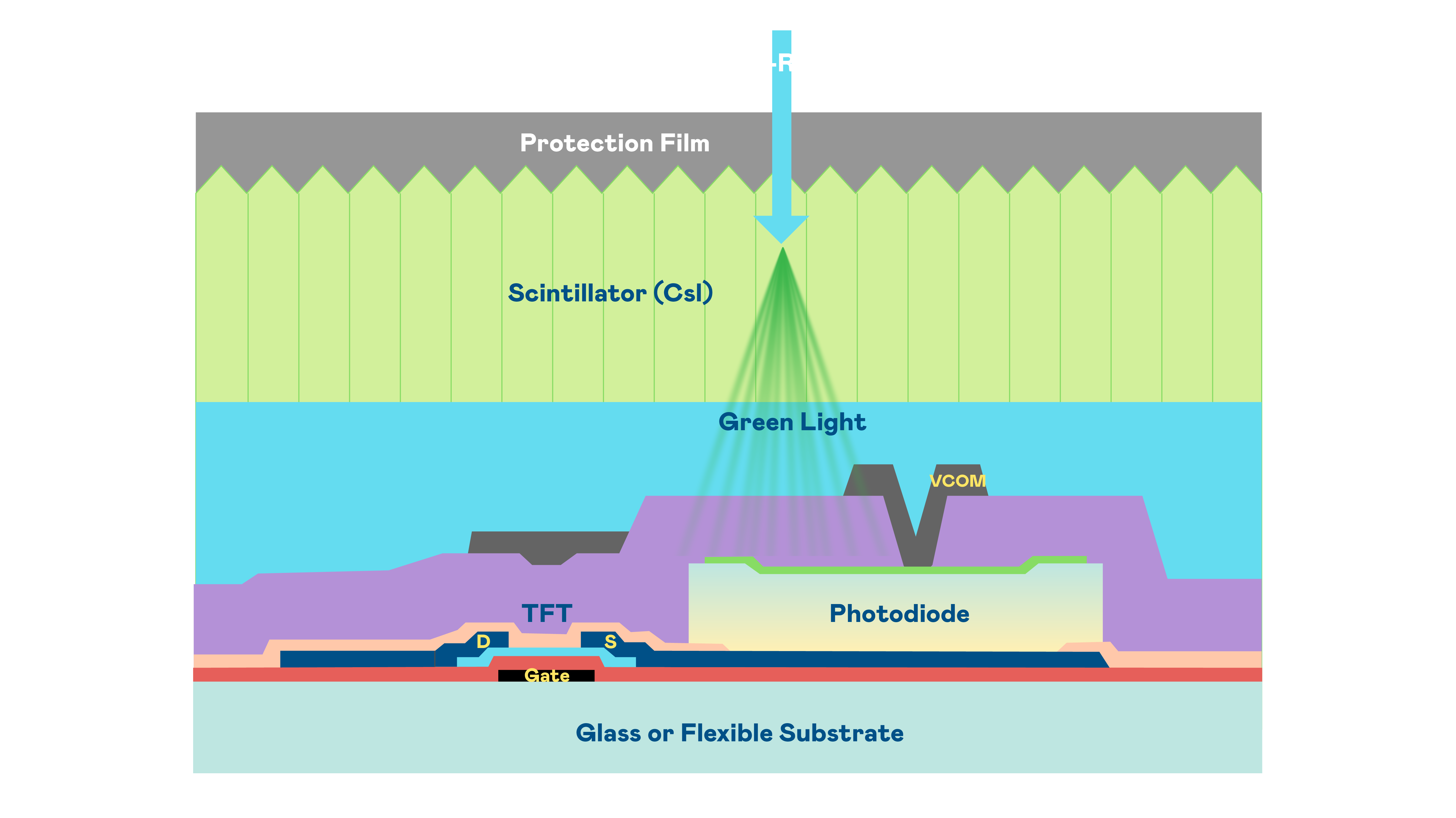 PA视讯的X光影像感測陣列使用薄膜電晶體 (TFT) 作為每個像素的讀取開關,搭配光電二極體(Photodiode)的光電轉換元件,用以感測X光影像訊號。